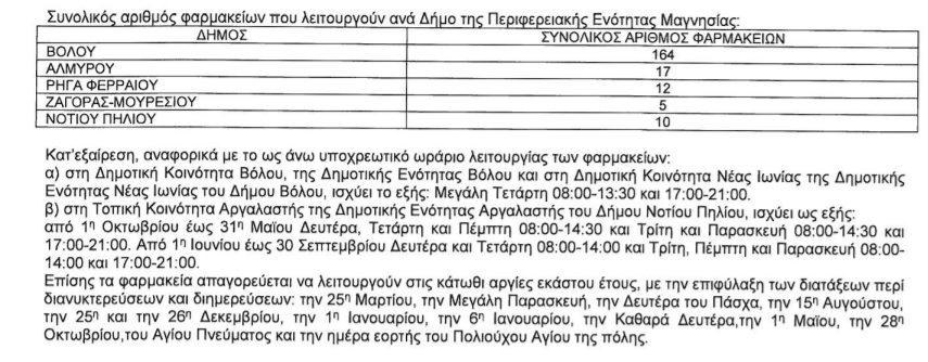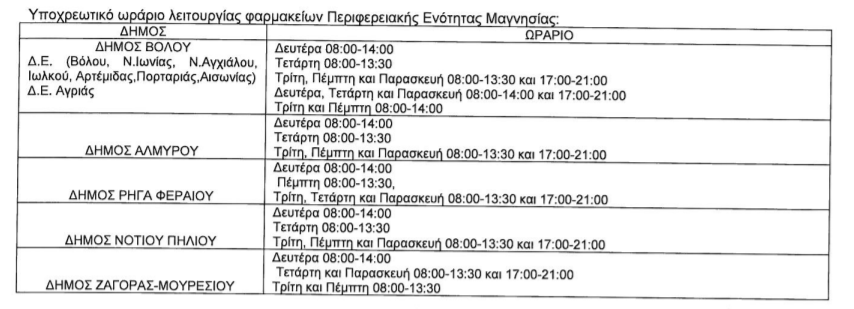 Το υποχρεωτικό ωράριο των φαρμακείων της Μαγνησίας για το 2022 αποφάσισε η Περιφέρεια Θεσσαλίας. Η απόφαση αυτή είναι η πρόταση του Φαρμακευτικού Συλλόγου Μαγνησίας που ελήφθη στη πρόσφατη Γενική Συνέλευση του Συλλόγου.