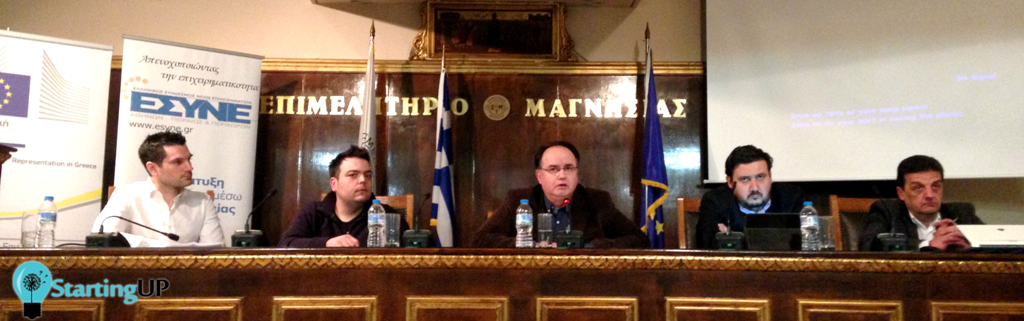 Στην ασφυκτικά γεμάτη αίθουσα του Επιμελητηρίου Μαγνησίας πραγματοποιήθηκε χθες Δευτέρα 13 Φεβρουαρίου με μεγάλη επιτυχία το StartingUP Βόλου στο πλαίσιο του 1ου Roadshow Καινοτομίας & Επιχειρηματικότητας, το οποίο διοργανώνεται από την Ευρωπαϊκή Επιτροπή και τον Ελληνικό Σύνδεσμο Νέων Επιχειρηματιών (ΕΣΥΝΕ) σε 20 πόλεις ανά την Ελλάδα με αφορμή τα νέα χρηματοδοτικά εργαλεία για μικρές-μεσαίες επιχειρήσεις και startups που ανακοινώθηκαν στον πλαίσιο των δράσεων του Πακέτου Γιούνκερ.