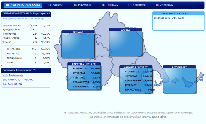 Το πρώτο εκλογικό αποτέλεσμα για την ΠΕ Μαγνησίας έρχεται από τον Αλμυρό και δίνει 53,91% στον συνδυασμό του κ. Αγοραστού, 39,06% στον κ. Κουρέτα, 4,69% στην κ. Τζανακούλη, 2,34% στον κ. Τσιαπλέ.