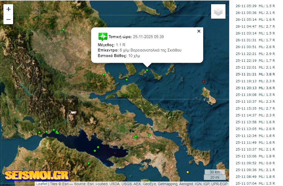 Χθες 25 Νοεμβρίου, στις 05.39 έγινε σεισμός 1,1 R με επίκεντρο στον θαλάσσιο χώρο 6 χλμ. Βορειοανατολικά της Σκιάθου και εστιακό βάθος 10 χλμ.