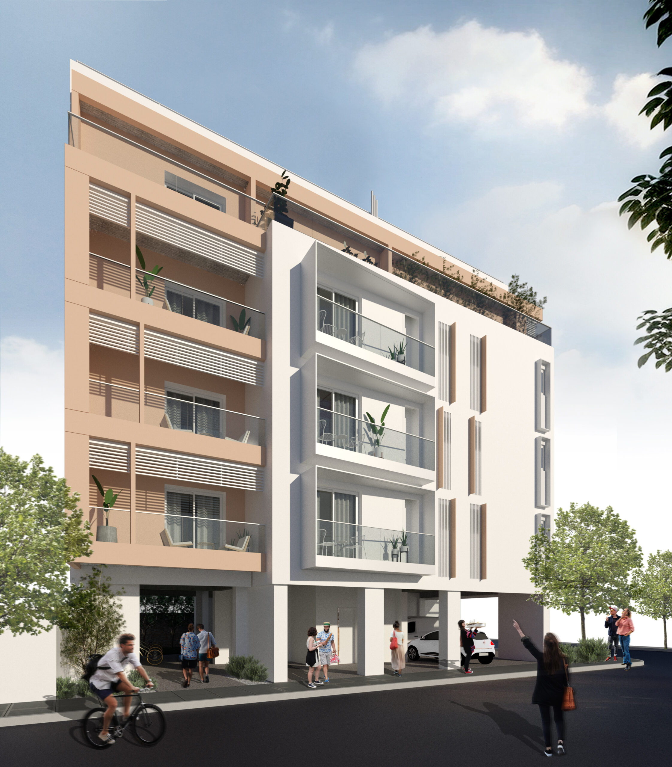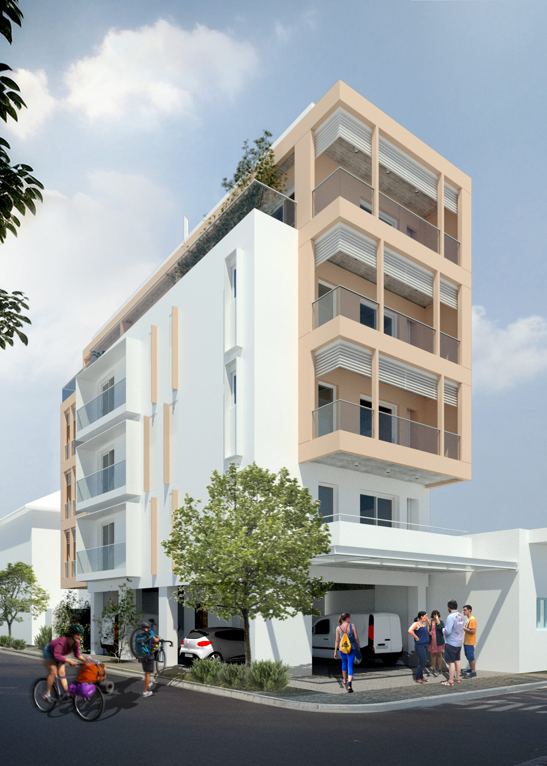 Ογκομετρικά, το κτίριο συντίθεται από μέσα προς τα έξω. Τα δυάρια ομαδοποιούνται μορφολογικά και χρωματικά με τον διαχωρισμό των όγκων τους κι ενώνονται μέσω της πλάκας του Δ’ ορόφου, με εξαίρεση το διαμέρισμα του Α’ ορόφου, ο εξώστης του οποίου στεγάζει εν μέρει τη στοά προς την οδό 28ης Οκτωβρίου. Τα γωνιακά διαμερίσματα υποχωρούν από τη συμβολή των οδών Γαμβέτα με 28ης Οκτωβρίου για περισσότερη προστασία από την πολυσύχναστη κίνηση της περιοχής. Μεταλλικές περσίδες οριζόντιας σκίασης δημιουργούν μια δεύτερη «μάσκα» προστασίας στους εξώστες, οι οποίοι περικλείονται από γυάλινα κιγκλιδώματα. Αντιθέτως, οι εξώστες των studios περιγράφονται από μεταλλικά λευκά στοιχεία κι εξέχουν από τον πλαϊνό τοίχο της οδού Γαμβέτα με μια ελαφριά κλίση προς το παραλιακό μέτωπο. Στα λουτρά με πρόσοψη επίσης επί της οδού Γαμβέτα τοποθετούνται κάθετα μεταλλικά στοιχεία σε συνέχεια της θερμοπρόσοψης για ιδιωτικότητα. Τέλος, σε όλη την ανάπτυξη του κτιρίου συναντάμε κολώνες είτε από μπετό είτε από μέταλλο, τοποθετημένες ακανόνιστα στις όψεις, προσδίδοντας ενότητα και αρμονία στο σύνολο.