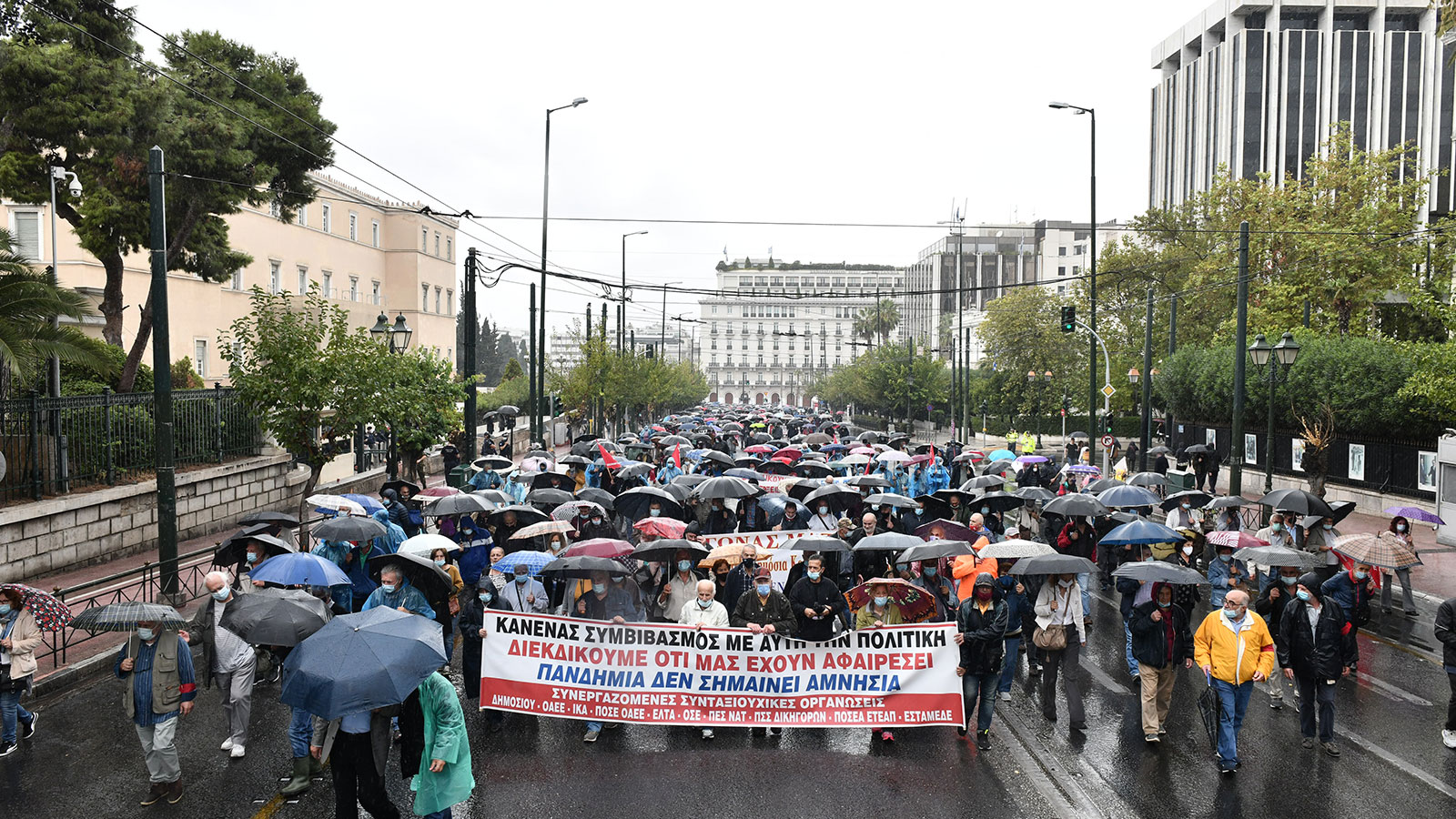 Οι συνταξιούχοι συγκεντρώθηκαν στην πλ. Κλαυθμώνος όπου μίλησε ο Δήμος Κουμπούρης – πρόεδρος της Ομοσπονδίας Συνταξιούχων ΙΚΑ και αμέσως μετά, παρά τη δυνατή βροχή, πορεύθηκαν δυναμικά ως το Μέγαρο Μαξίμου.