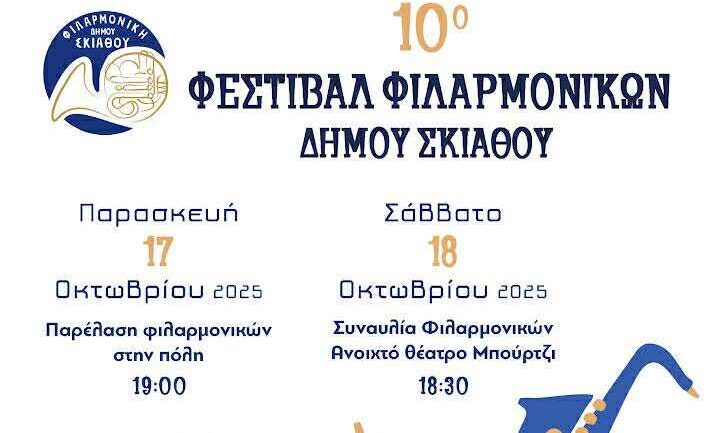 Το 10ο Φεστιβάλ Φιλαρμονικών διοργανώνει ο Δήμος Σκιάθου το διάστημα 17 & 18 Οκτωβρίου 2025, σε συνδιοργάνωση με την Περιφέρεια Θεσσαλίας.