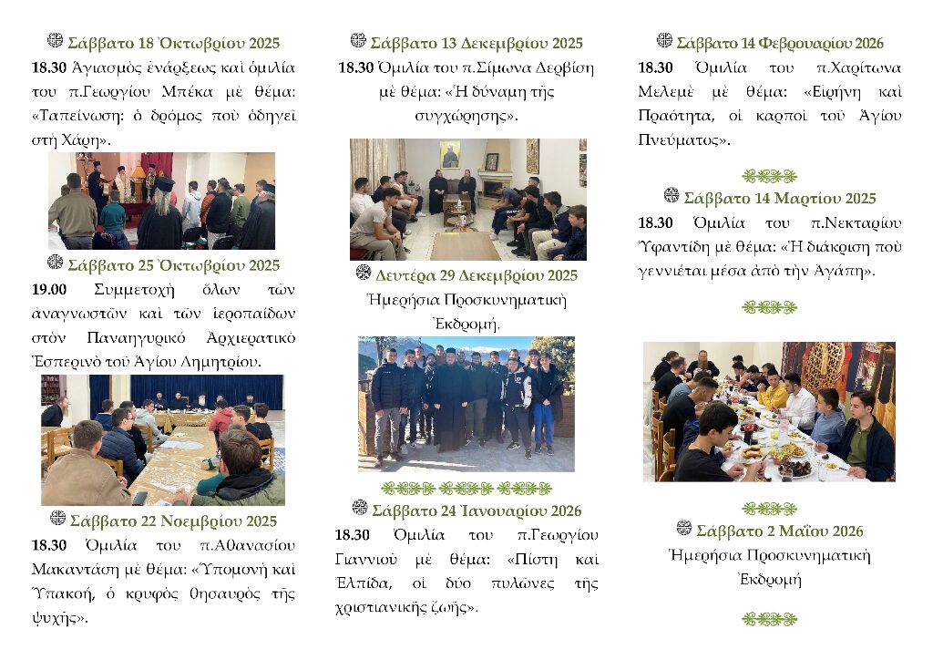 Ο Αρχιδιάκονος και υπεύθυνος του τομέα αναγνωστών, π. Ιάκωβος Πρώιας, αναφέρθηκε στη σημασία των συναντήσεων και στο γεγονός ότι ο θεσμός λειτουργεί για δεύτερη χρονιά στην επαρχία του Αλμυρού. Τέλος, παρουσιάστηκε επίσης το ετήσιο πρόγραμμα των συναντήσεων, που φέτος θα έχει ως βασικό θέμα τις αρετές. Οι συναντήσεις θα πραγματοποιούνται σύμφωνα με το πρόγραμμα, στις 6:30 μ.μ., στον Ιερό Ναό Αγίου Δημητρίου Αλμυρού.