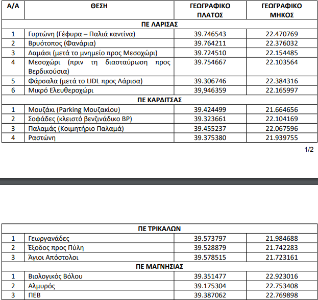 Τα σημεία των απολυμαντικών σταθμών, ανά Π.Ε., σε όλη την Περιφέρεια Θεσσαλίας είναι τα κάτωθι: