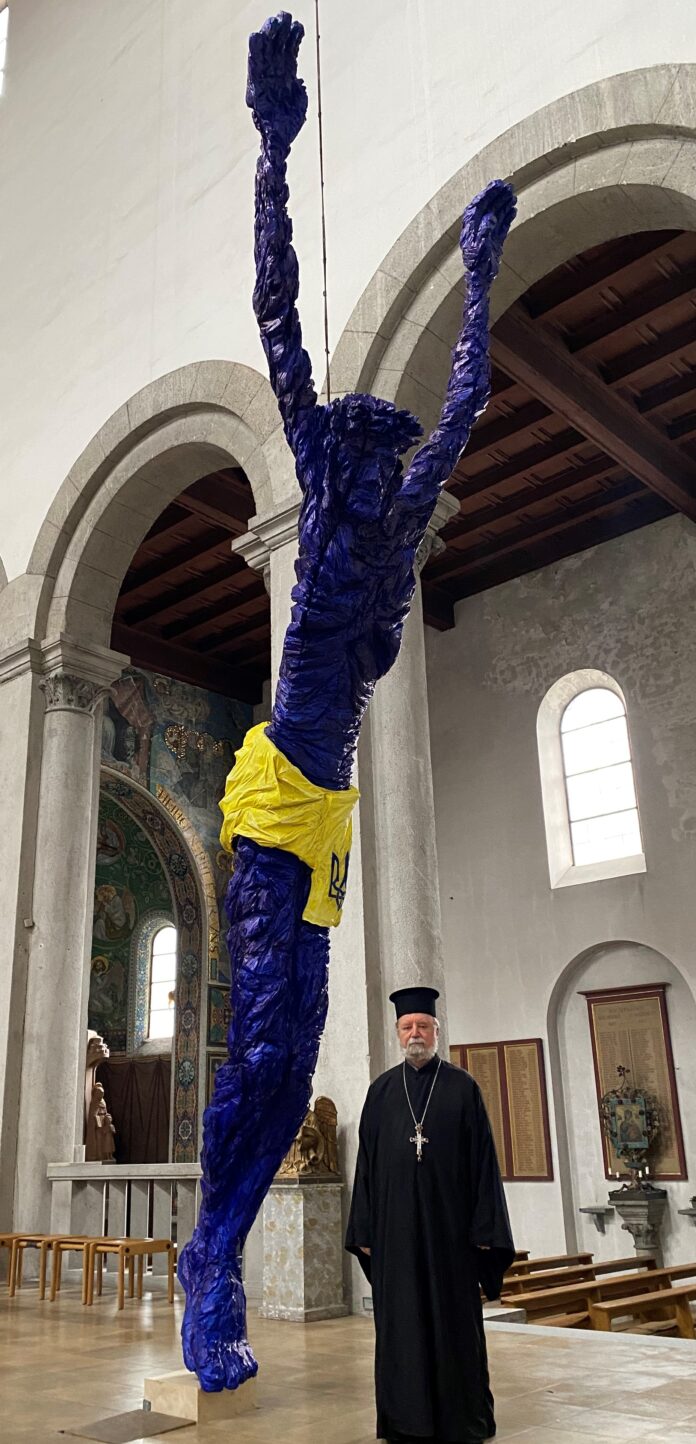 Όπως ο ίδιος εξηγεί το ξυλόγλυπτο σώμα του Χριστού έχει ύψος 7 μέτρων και βάρος 500 κιλών. Είναι βαμμένο με μπλε χρώμα, που συμβολίζει τη θεϊκή φύση του και στη μέση φέρει ένα κίτρινο περιτύλιγμα ως εντυπωσιακή ένδειξη για την ειρήνη στην Ουκρανία. Αφορμή για την τοποθέτησή του στο ναό αποτελεί φυσικά ο πόλεμος στην Ουκρανία με το γλυπτό να κρέμεται σχεδόν αιωρούμενο στον ναό του Αγίου Μαξιμιλιανού στο Μόναχο.