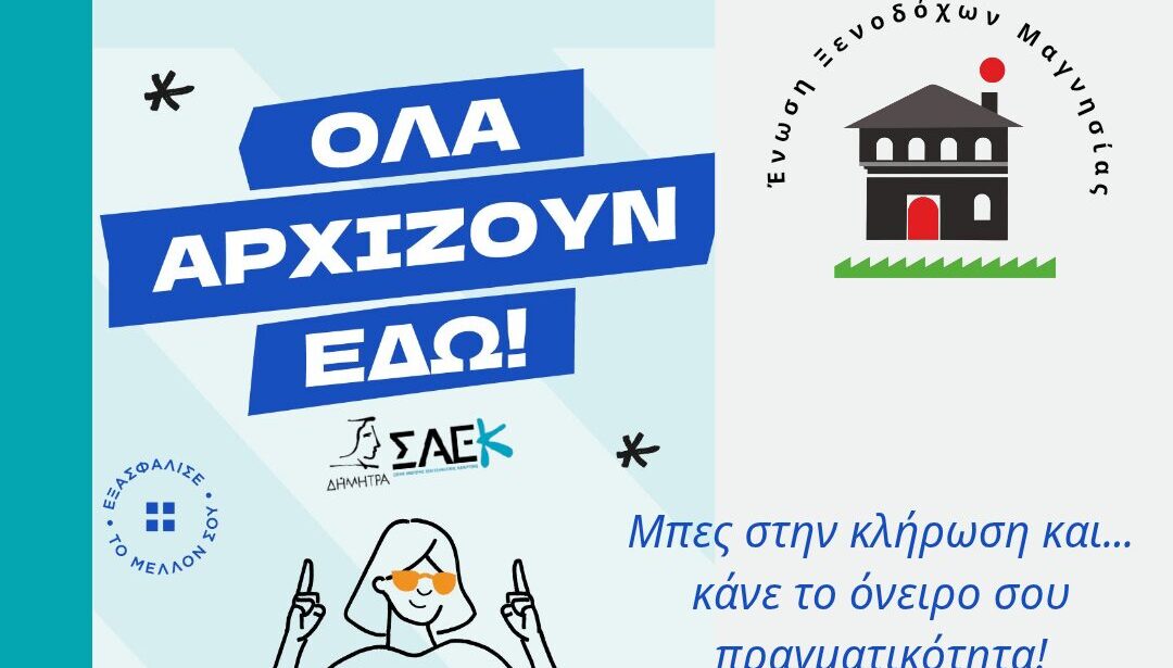 Η Διοίκηση της ΣΑΕΚ ΔΗΜΗΤΡΑ και η Ένωση Ξενοδόχων Ν. Μαγνησίας εύχονται με ανακοίνωσή τους καλές σπουδές και καλή σταδιοδρομία στον τυχερό ή την τυχερή της κλήρωσης αλλά και σε όλους του σπουδαστές.