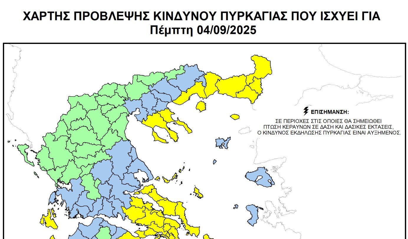 Η Π.Ε. Μαγνησίας και Σποράδων ενημερώνει ότι σύμφωνα με τον Ημερήσιο Χάρτη Πρόβλεψης Κινδύνου Πυρκαγιάς της Γενικής Γραμματείας Πολιτικής Προστασίας, για την Πέμπτη 04 Σεπτεμβρίου 2025, προβλέπεται Κατηγορία Κινδύνου 3 (υψηλή) για τα νησιά των Β. Σποράδων και παραμένουν σε ετοιμότητα οι αρμόδιες υπηρεσίες και φορείς της Περιφέρειας, σε συνεργασία με το Πυροσβεστικό Σώμα και τις Δασικές Υπηρεσίες, για την πρόληψη και άμεση αντιμετώπιση πιθανών πυρκαγιών.