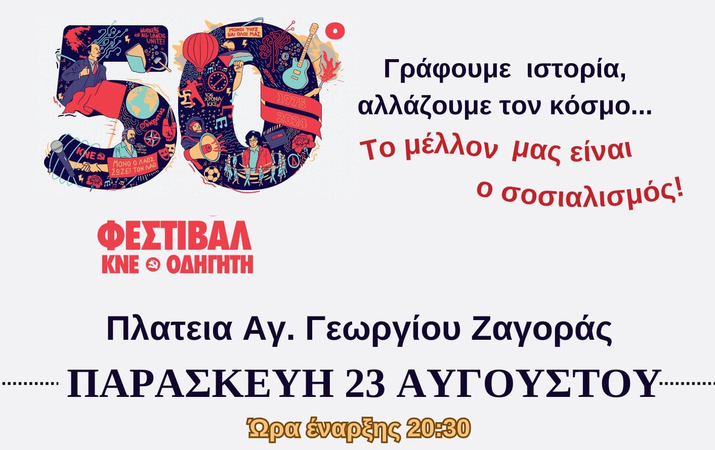 Το 50ο Φεστιβάλ ΚΝΕ Οδηγητή θα πραγματοποιηθεί και στη Ζαγορά Πηλίου, σήμερα Παρασκευή 23 Αυγούστου, στις 20:30 και στην πλατεία του Αγίου Γεωργίου.
