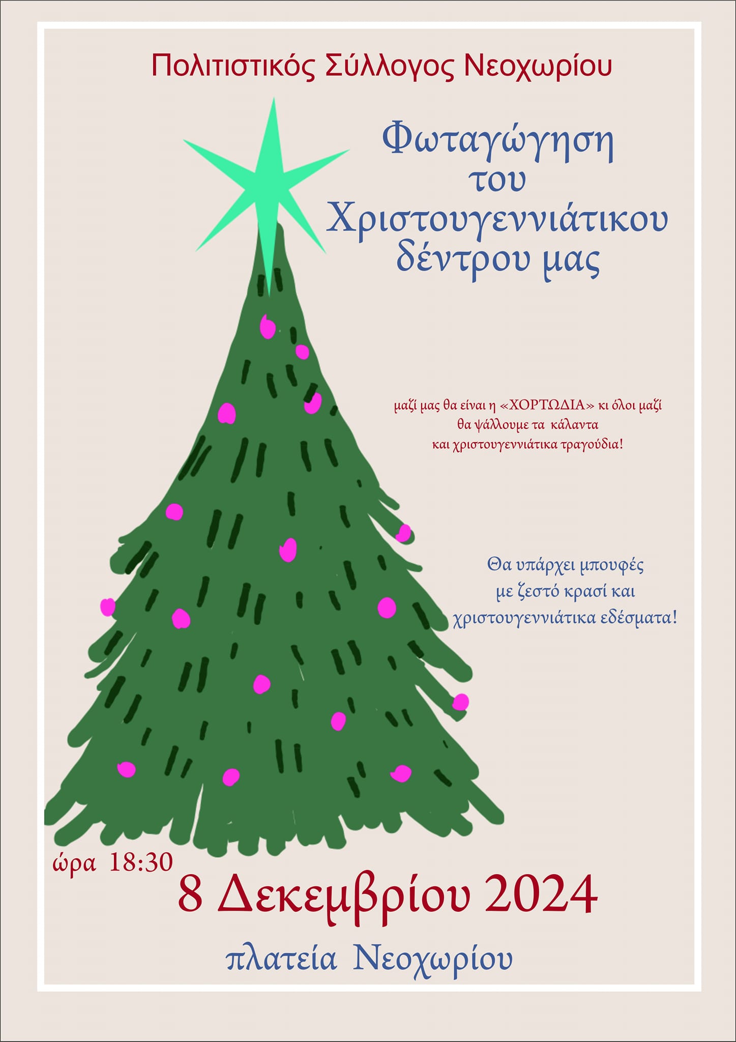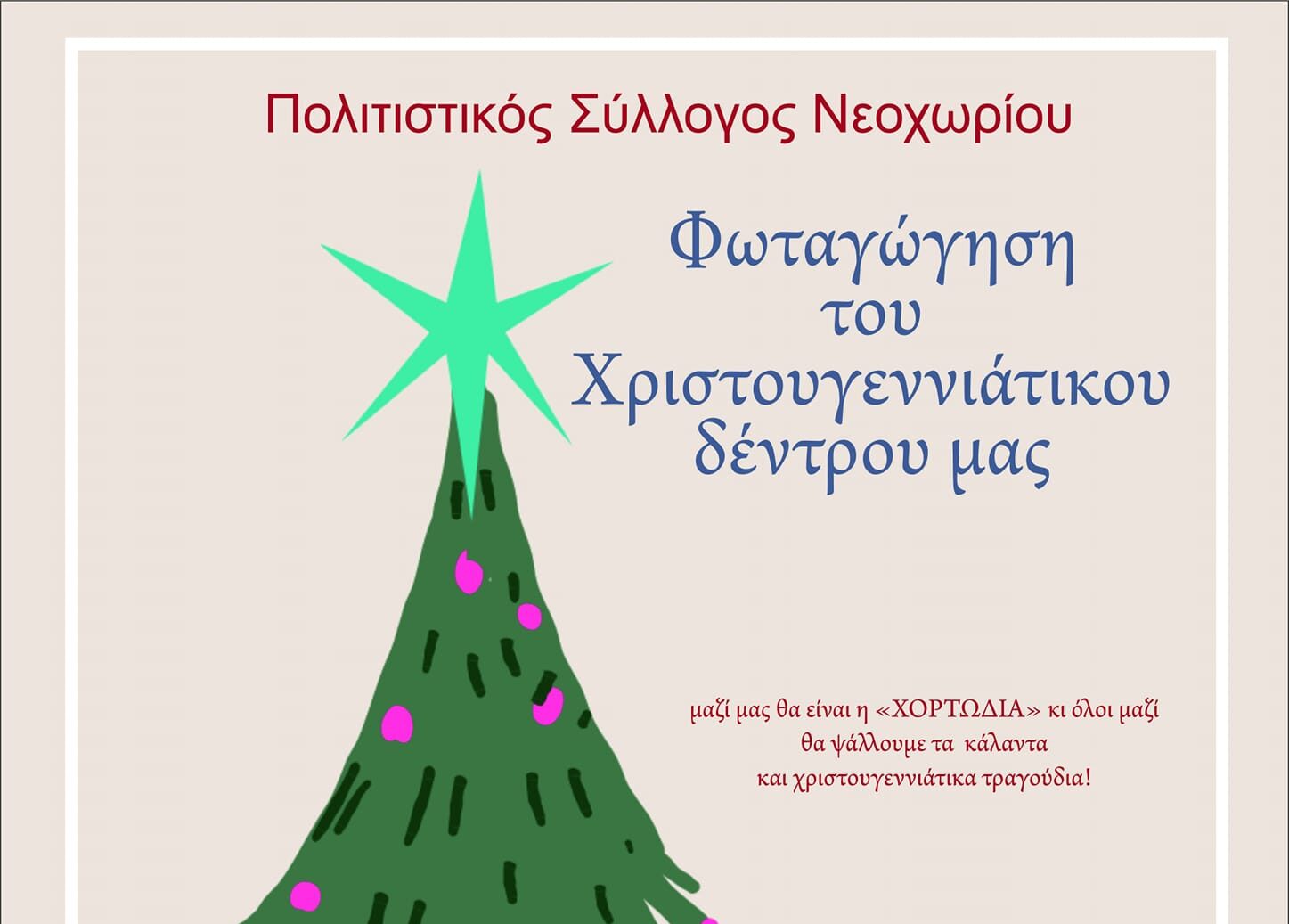 Την Κυριακή 8 Δεκεμβρίου στις 18:30 θα πραγματοποιηθεί το άναμμα του χριστουγεννιάτικου δέντρου στο Νεοχώρι, μια εκδήλωση, που έχει επιμεληθεί ο Πολιτιστικός Σύλλογος Νεοχωρίου.