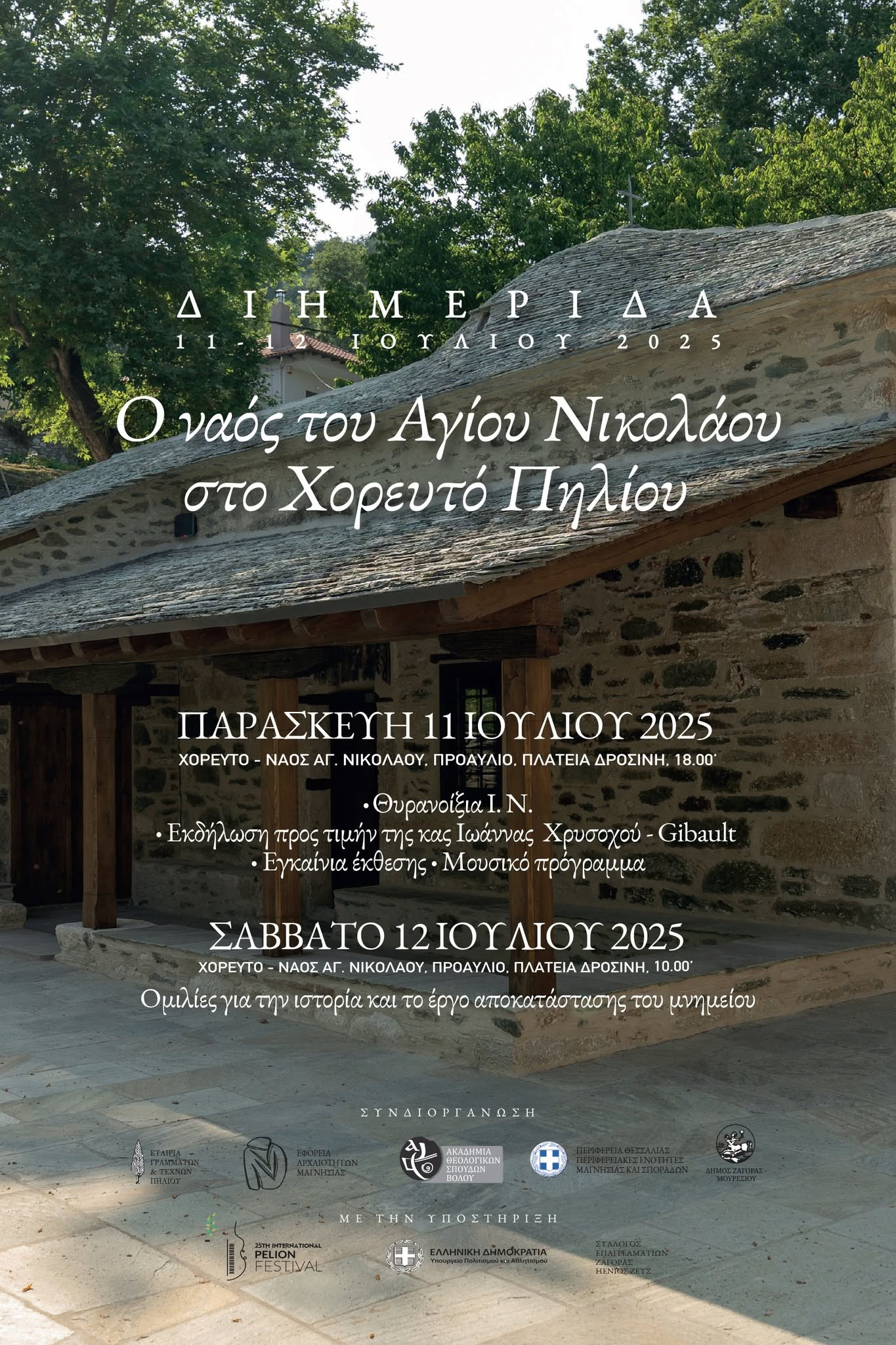 Συγκεκριμένα, την Παρασκευή 11 Ιουλίου, στις 18:Ο0, θα πραγματοποιηθούν τα θυρανοίξια του ναού από τον Μητροπολίτη Δημητριάδος κ. Ιγνάτιο και τα εγκαίνια της έκθεσης «Ο ναός του Αγίου Νικολάου στο Χορευτό Πηλίου: Το μνημείο και το έργο της αποκατάστασής του», ενώ στη συνέχεια θα τιμηθεί η χορηγός του έργου, κ. Ιωάννα Χρυσοχού-Gibault, για την προσφορά της στην αποκατάσταση του μνημείου.