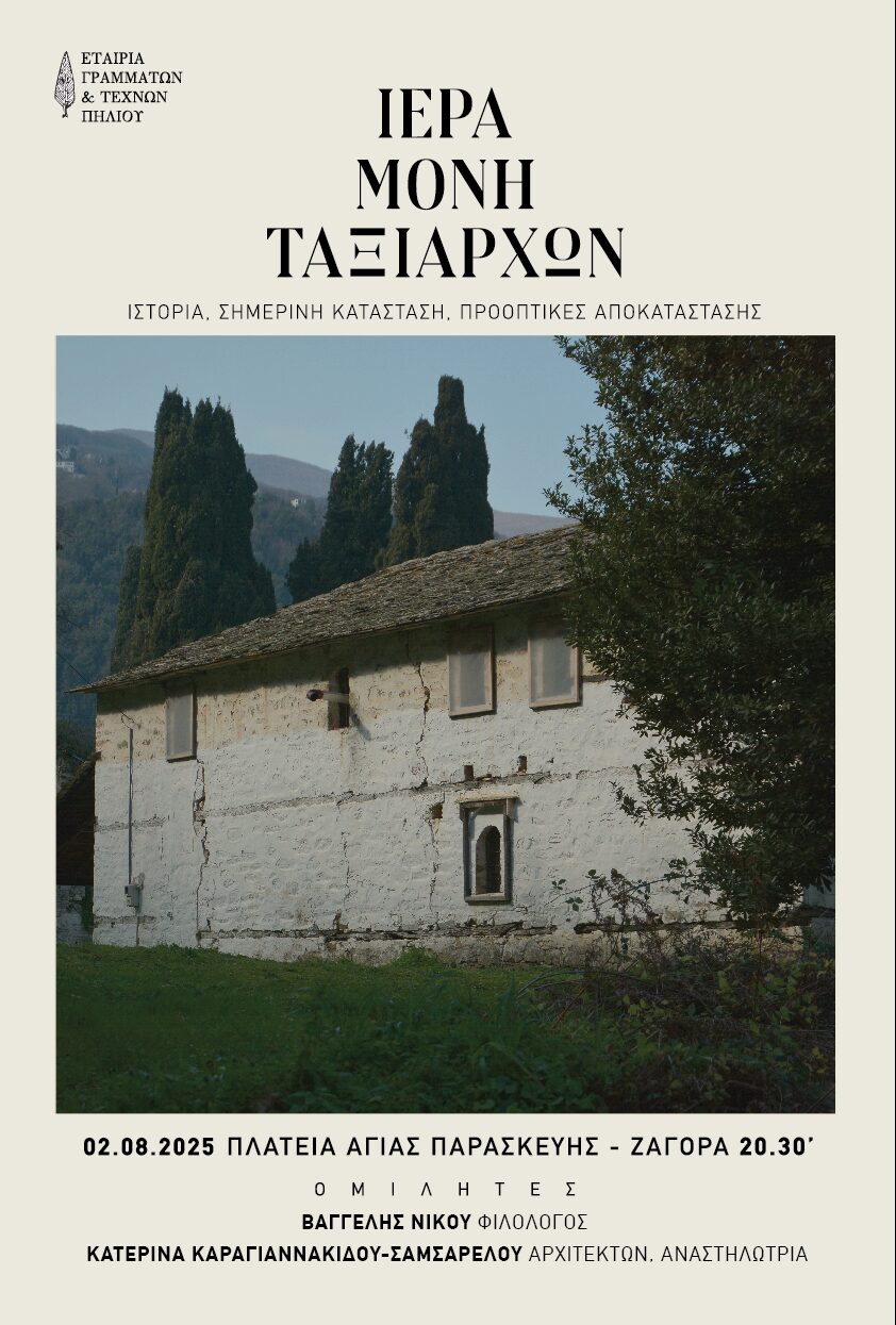 Εκδήλωση με θέμα το μνημείο της Μονής των Ταξιαρχών διοργανώνει η Εταιρία Γραμμάτων και Τεχνών Πηλίου στην πλατεία της Ζαγοράς, το Σάββατο 2 Αυγούστου στις 20.30. Η εκδήλωση σκοπό έχει να προσφέρει μια ενημέρωση σε κάθε ενδιαφερόμενο τόσο για την ιστορία του, όσο και για την νυν κατάσταση και την κατεπείγουσα ανάγκη σωστικών επεμβάσεων.