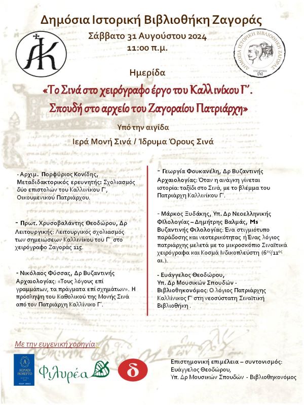 Το Σάββατο 31 Αυγούστου 2024 και ώρα 11:00 π.μ., η Δημόσια Ιστορική Βιβλιοθήκη Ζαγοράς υπό την αιγίδα της Ιεράς Μονής Σινά / Ίδρυμα Όρους Σινά, διοργανώνει επιστημονική ημερίδα με θέμα: Το Σινά στο χειρόγραφο έργο του Πατριάρχη Καλλινίκου Γ΄. Σπουδή στο αρχείο του Ζαγοραίου Πατριάρχη.