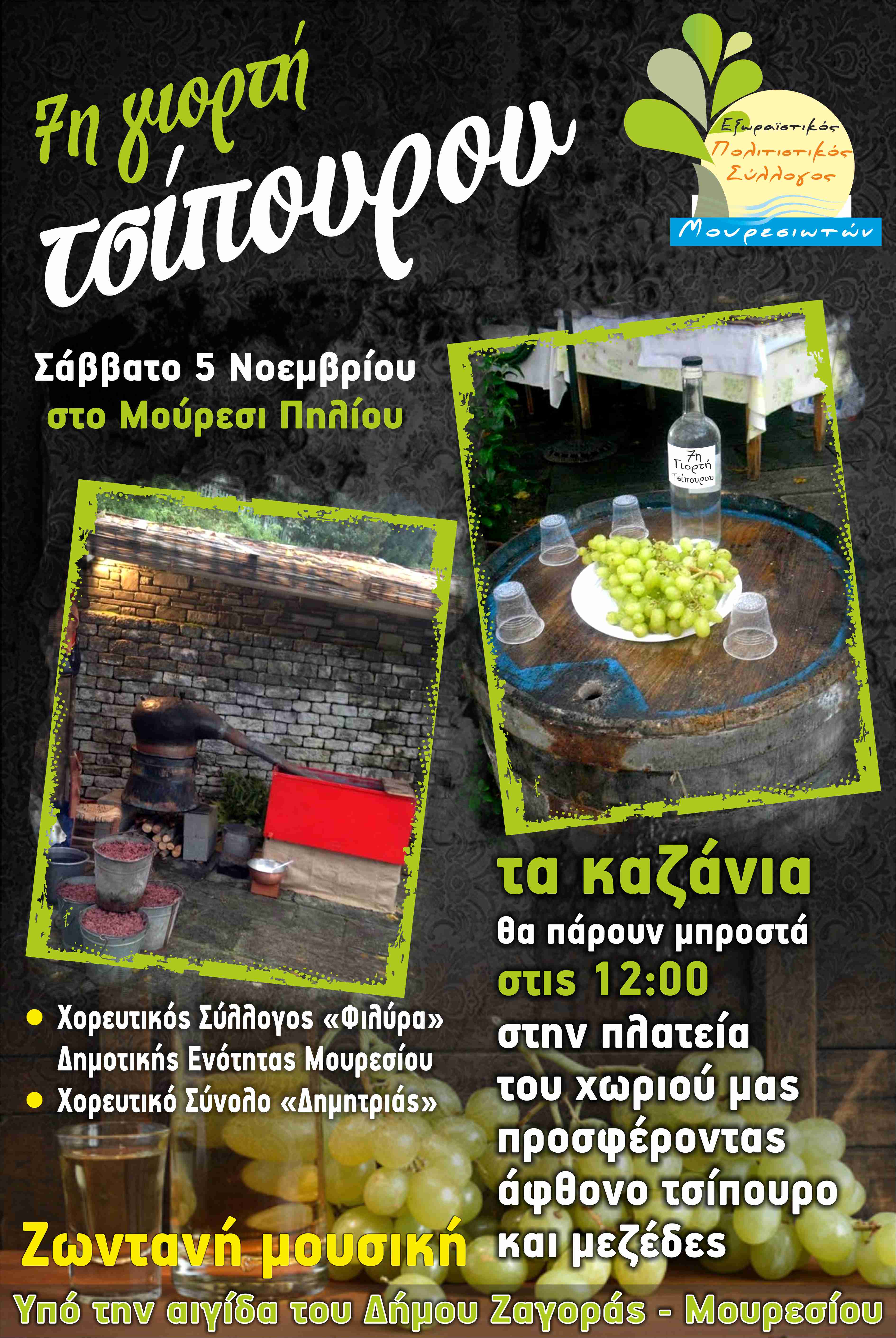 Ο εξωραϊστικός πολιτιστικός σύλλογος Μουρεσιωτών Μαγνησίας διοργανώνει την 7η γιορτή τσίπουρου αύριο Σάββατο 5 Νοεμβρίου 2022 και ώρα 12 το μεσημέρι στην κεντρική πλατεία Μουρεσίου. Την εκδήλωση θα πλαισιώσουν χορευτικά συγκροτήματα . «Ελάτε να σας κεράσουμε άφθονο τσίπουρο και νόστιμους τσίπουρο μεζέδες».