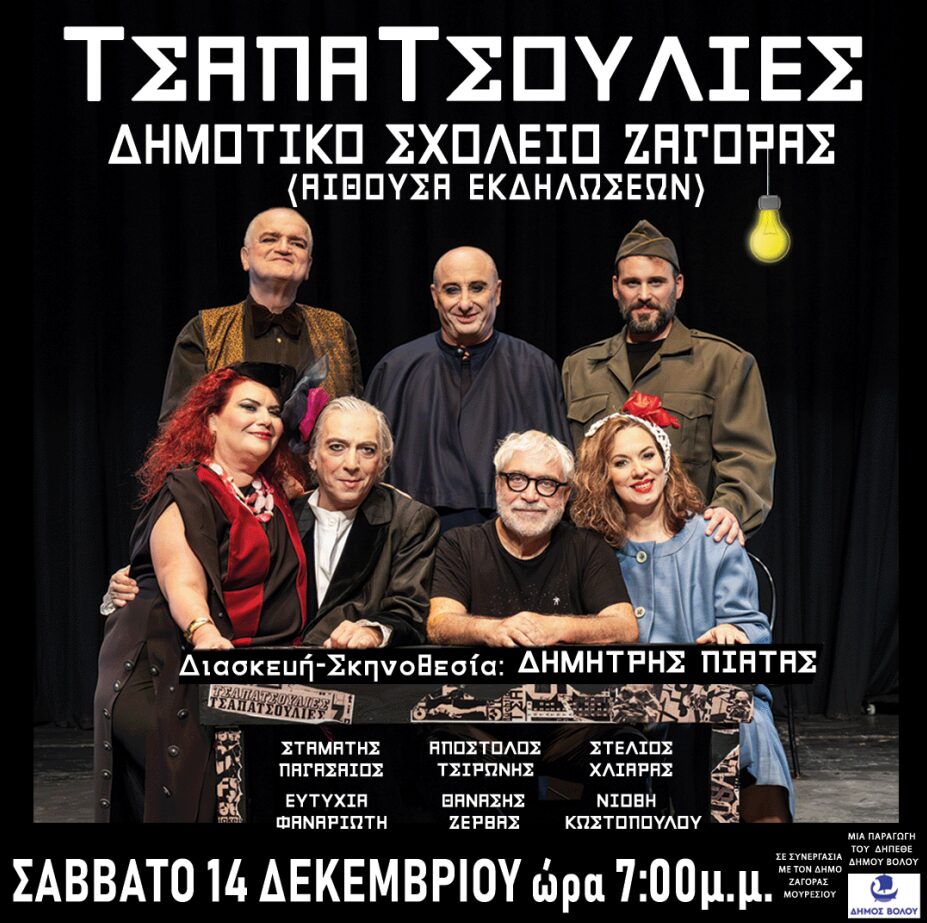 Το προσεχές Σάββατο 14 Δεκεμβρίου 2024 & ώρα 7.00μ.μ. στην αίθουσα εκδηλώσεων του Δημοτικού Σχολείου Ζαγοράς, ο Δήμος Ζαγοράς Μουρεσίου σε συνεργασία με το ΔΗ.ΠΕ.ΘΕ Δήμου Βόλου παρουσιάζει τη θεατρική παράσταση “Τσαπατσουλιές” για τους κατοίκους και τους επισκέπτες του Ανατολικού Πηλίου.