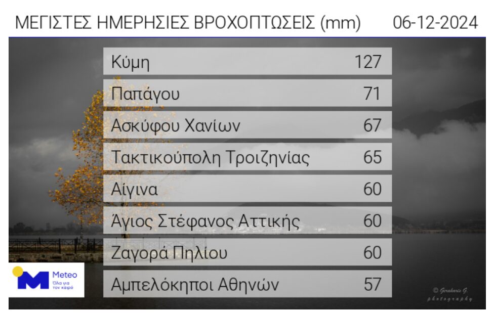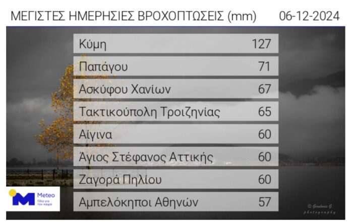 Ο καιρός σήμερα στη Μαγνησία είναι βροχερός, όπως είχαν προβλέψει οι μετεωρολόγοι και η Ζαγορά είναι στη λίστα του meteo.gr για τις περιοχές που δέχτηκαν τις μέγιστες ημερήσιες βροχοπτώσεις στην Ελλάδα. Συγκεκριμένα, πρώτη στη λίστα είναι η Κύμη με 127mm βροχής, ακολουθεί η περιοχή Παπάγου στην Αθήνα, ενώ η Ζαγορά είναι στην 7η θέση με 60mm βροχής.