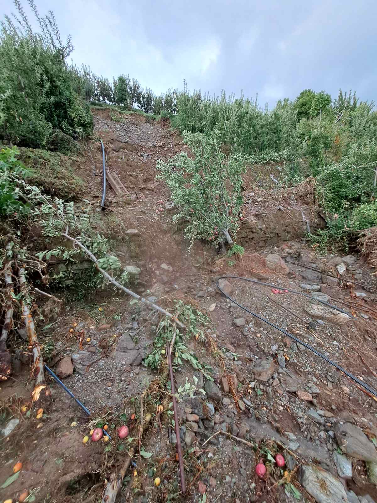 Η εικόνα που επικρατεί στις καλλιέργειες είναι σοκαριστική, δέντρα έχουν παρασυρθεί, τα μήλα έχουν πέσει εξαιτίας του ανέμου και υπάρχει και φθορά λόγω του χαλαζιού που έπεφτε κατά τόπους. Οι καστανιές έχουν και αυτές μεγάλες ζημιές λόγω των έντονων ανέμων.