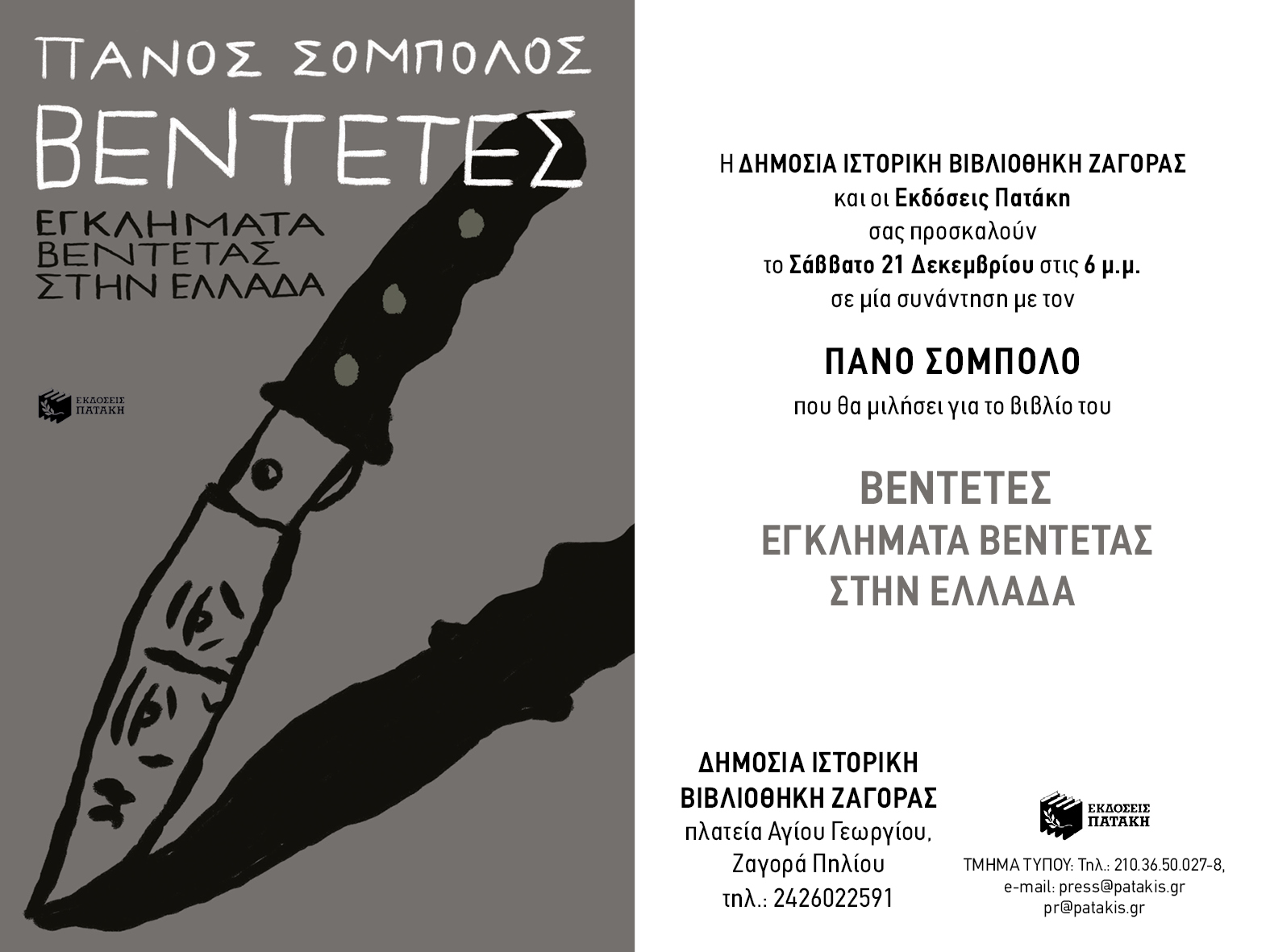 Η Δημόσια Ιστορική Βιβλιοθήκη Ζαγοράς και οι Εκδόσεις Πατάκη διοργανώνουν το Σάββατο 21 Δεκεμβρίου στις 6 το απόγευμα μία συνάντηση με τον Πάνο Σόμπολο, ο οποίος θα μιλήσει για το βιβλίο του με τίτλο «Βεντέτες. Εγκλήματα βεντέτας στην Ελλάδα».
