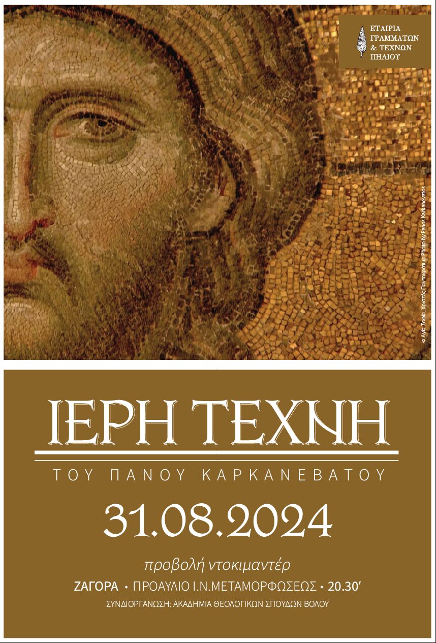 Η τελευταία εκδήλωση για το φετινό καλοκαίρι διοργανώνεται απ΄την «Εταιρία Γραμμάτων και Τεχνών Πηλίου» σήμερα 31 Αυγούστου στις 8.30 το βράδυ στο προαύλιο του Ναού Μεταμορφώσεως στη Ζαγορά. Όπως αναφέρεται σε σχετική ανακοίνωση, «τον δημιουργό θα παρουσιάσει η κ. Μαρία Νάνου, ιστορικός βυζαντινής τέχνης, μέλος του ΔΣ της εταιρίας μας. Ο κ. Καρκανεβάτος θα μας τιμήσει με την παρουσία του και μετά την προβολή θα υπάρξει δυνατότητα κάποιων ερωτήσεων.