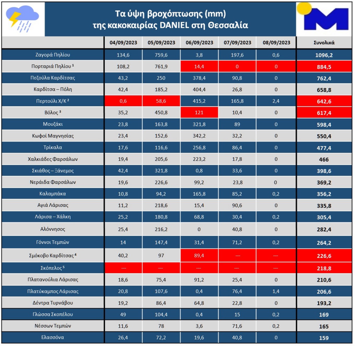 Τα ημερήσια και αθροιστικά ύψη βροχόπτωσης της κακοκαιρίας Daniel στη Θεσσαλία παρουσιάζει το Εθνικό Αστεροσκοπείο Αθηνών/meteo.gr σε σχετικό πίνακα.