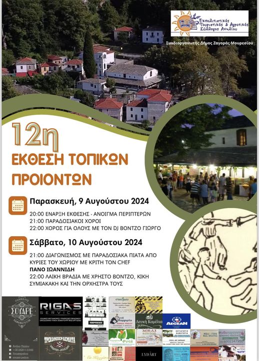 Ξεκινάει σήμερα η 12η έκθεση Τοπικών Προϊόντων στο Ανήλιο με την έναρξη της έκθεσης το άνοιγμα περιπτέρων και χορό για όλους από DJ, ενώ αύριο Σάββατο στις 9 το βράδυ θα γίνει διαγωνισμός παραδοσιακών πιάτων γυναικών του χωριού με 20 συμμετέχοντες και με κριτή τον σεφ Πάνο Ιωαννίδη, ενώ θα ακολουθήσει λαϊκή βραδιά.