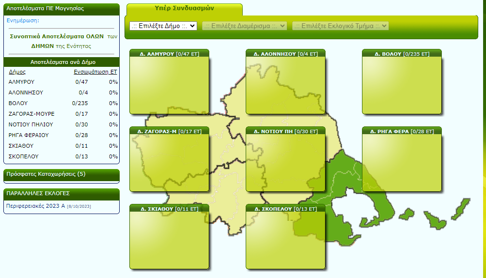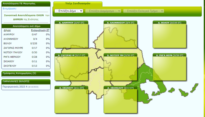 Δείτε σε πραγματικό χρόνο τα αποτελέσματα του πρώτου γύρου των αυτοδιοικητικών εκλογών στους περιφερειακούς δήμους της Μαγνησίας, όπως τα μεταδίδει το Υπουργείο Εσωτερικών και η Περιφέρεια Θεσσαλίας