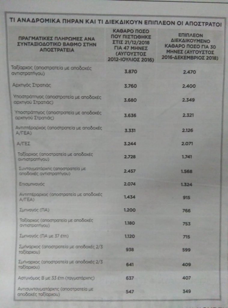 Οι απόστρατοι, όπως καταγγέλλουν μέσα από τις Ενώσεις τους, πήραν αναδρομικά για μικρότερο διάστημα, ενώ περίμεναν μέχρι Δεκέμβριο 2018 και επιπρόσθετα τους έκοψαν το ποσό που θα έπρεπε να είχαν στη μηνιαία τους σύνταξη μετά την πλήρη αποκατάσταση των απωλειών που κρίθηκαν αντισυνταγματικές από το Συμβούλιο της Επικρατείας.
