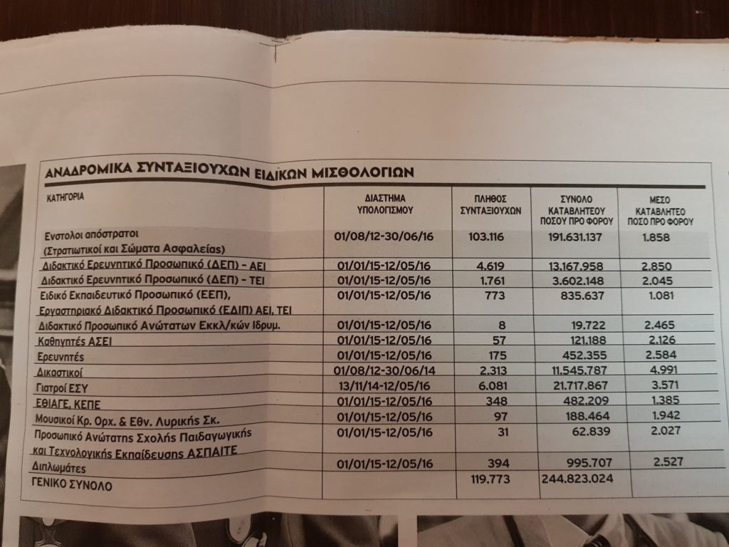 Σύμφωνα με την εφημερίδα ΕΘΝΟΣ, τα ποσά που ξεκίνησαν να δίνονται στους συνταξιούχους των ειδικών μισθολογίων αποτυπώνονται αναλυτικά στον παρακάτω πίνακα: