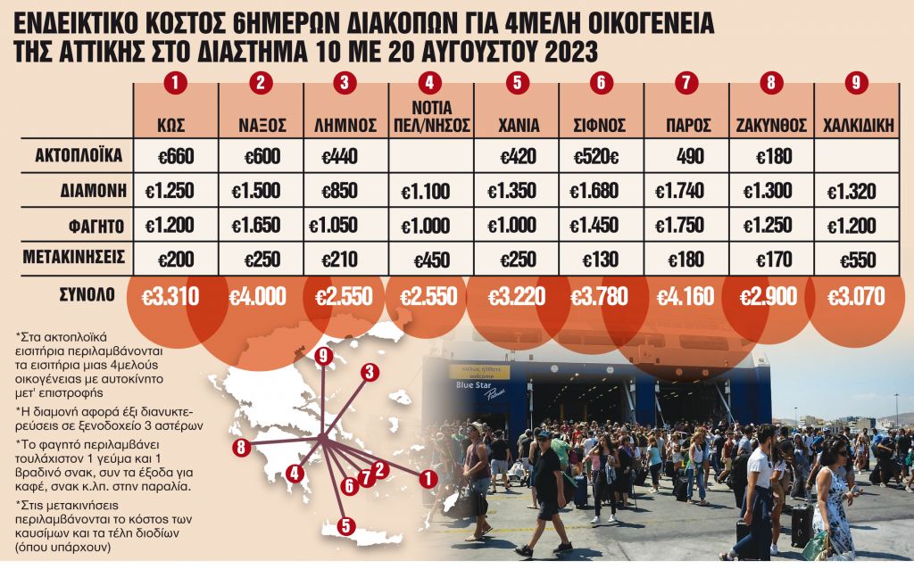 Η νέα θερινή περίοδος που ξεκίνησε δυναμικά από τις αρχές Μαΐου συνοδεύεται από το πιο υψηλό «εξοδολόγιο» διακοπών. Με τα διαθέσιμα στοιχεία των ξενοδοχειακών και των ακτοπλοϊκών επιχειρήσεων, εκτιμάται ότι το βασικό πακέτο διακοπών θα αυξηθεί κατά μέσο όρο τουλάχιστον κατά 15% έως 20% σε σχέση με πέρυσι.
