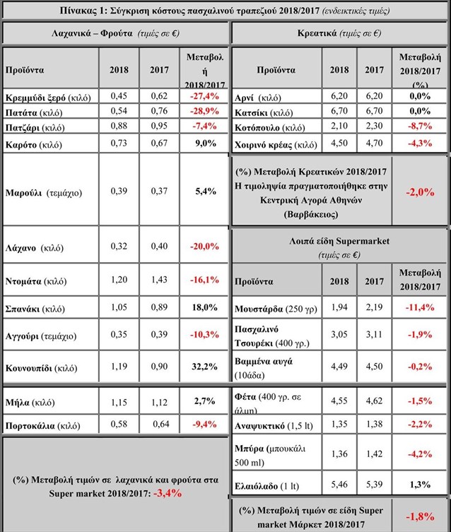 Η πτωτική τάση των τιμών στα φρούτα και στα λαχανικά αποτέλεσε τη σημαντικότερη παράμετρο της μείωση του κόστους μεταξύ των πασχαλινών τραπεζιών 2018/2017, με τις εντονότερες μεταβολές να καταγράφονται στις τιμές της πατάτας (-28,9%) και των κρεμμυδιών (-27,4%), ενώ στον αντίποδα αυξητικά κινήθηκε το επίπεδο των τιμών στο κουνουπίδι (32,2%) και στο σπανάκι (18,0%).