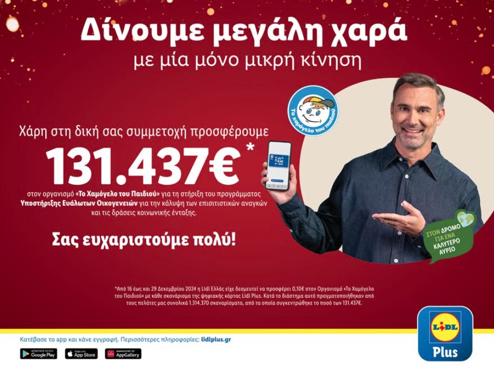 Η Lidl Ελλάς ολοκλήρωσε με επιτυχία τη χριστουγεννιάτικη πρωτοβουλία της για το 2024, αποδεικνύοντας για ακόμη μία φορά τη δέσμευσή της να στηρίζει έμπρακτα τους ευάλωτους συνανθρώπους μας. Από τις 16 έως και τις 29 Δεκεμβρίου 2024, με κάθε σκανάρισμα της ψηφιακής κάρτας Lidl Plus, η εταιρεία προσέφερε 0,10€ στον Οργανισμό «Το Χαμόγελο του Παιδιού».