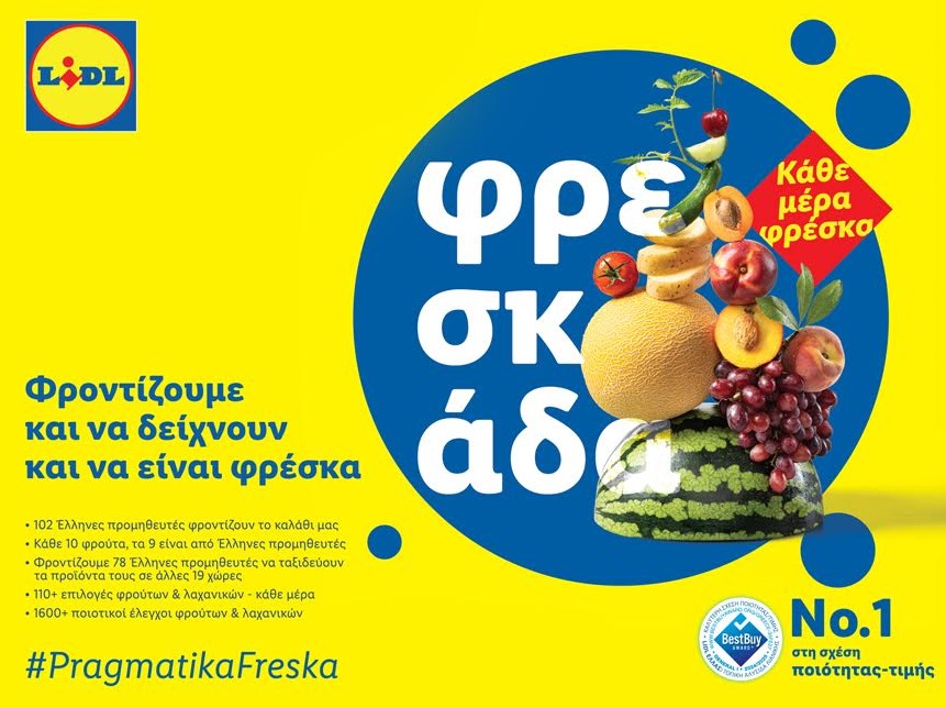 Η Lidl Ελλάς φροντίζει τα φρούτα και τα λαχανικά της να είναι όχι μόνο φρέσκα, αλλά και να φαίνονται φρέσκα.Η εταιρεία επενδύει στρατηγικά στην τοπική παραγωγή και στη διαφάνεια, στηρίζοντας την ελληνική γη και τους ανθρώπους της. Από κάθε 10 φρούτα που διατίθενται στα καταστήματα, τα 9 προέρχονται από Έλληνες προμηθευτές. Παράλληλα, 102 Έλληνες προμηθευτές συμβάλλουν καθημερινά στο καλάθι του καταναλωτή, με τους 78 εξ αυτών να εξάγουν τα προϊόντα τους σε 19 χώρες του εξωτερικού,επιφέροντας κύκλο εργασιώνπου ανέρχεταιστα €186εκ.