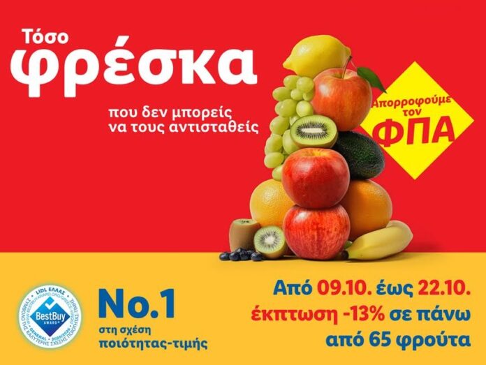 13% φθηνότερα φρέσκα φρούτα και λαχανικά, χάρη στην απορρόφηση του ΦΠΑ από τη Lidl Ελλάς.