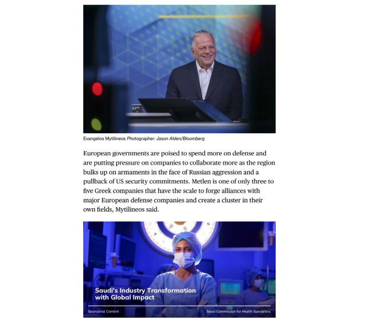 Η METLEN Energy & Metals «εξετάζει ενεργά και άλλες πιθανές αμυντικές συνεργασίες» εντός και εκτός Ελλάδας, δήλωσε ο Πρόεδρος και Διευθύνων Σύμβουλος, Ευάγγελος Μυτιληναίος, σε συνέντευξή του. Η εταιρεία «σίγουρα» μπορεί να διαδραματίσει ενισχυμένο ρόλο, ανέφερε, στο πλαίσιο μιας ευρύτερης ευρωπαϊκής προσπάθειας ενίσχυσης των αμυντικών δυνατοτήτων της ηπείρου.