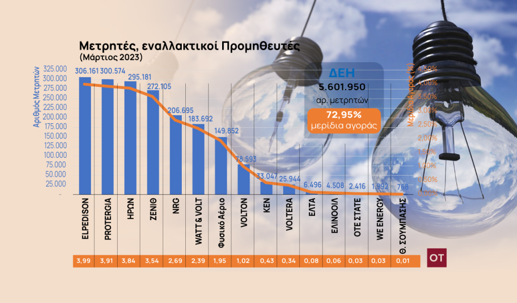 Σύμφωνα με τα στοιχεία του Μαρτίου, η δημόσια εταιρεία με βάση των αριθμό των μετρητών στη χαμηλή και μέση τάση, ηλεκτροδοτεί 5.601.950 μετρητές και κατέχει το 72,95% του συνόλου. Ακολουθούν με μικρές διαφορές μεταξύ τους η Elpedison(306.161), η Protergia (300.574), ο Ήρων (295.181) κ.ο.κ.