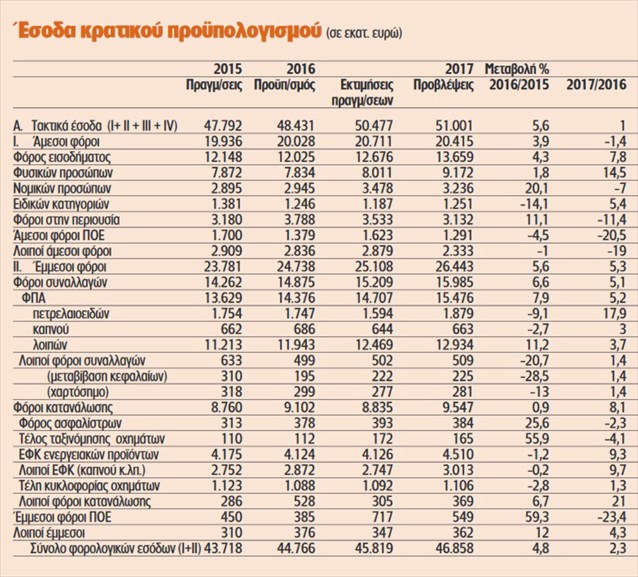 * Ο φόρος εισοδήματος φυσικών προσώπων αναμένεται να διαμορφωθεί στα 9.172 εκατ. ευρώ, αυξημένος κατά 1.161 εκατ. έναντι του 2016, λόγω των ανατροπών στη φορολογία εισοδήματος.