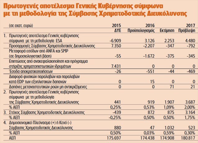 Θα πρέπει πάντως να αναφερθεί ότι ο εισπρακτικός στόχος για τον ΕΝΦΙΑ παραμένει στα 2,65 δισ. και το 2017, ενώ τα αυξημένα έσοδα που καταγράφονται στον προϋπολογισμό οφείλονται στην είσπραξη της τελευταίας δόσης του ΕΝΦΙΑ 2016, τον Ιανουάριο 2017, ποσού 323 εκατ. . Ωστόσο, το ποσό αυτό, σε δημοσιονομική βάση, θα καταγραφεί στο έτος 2016. Επισημαίνεται δε ότι το τίμημα από την πώληση των περιφερειακών αεροδρομίων υπολογίζεται σε 1,234 δισ. ευρώ.