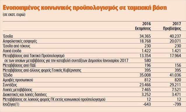 Το σύνολο των δαπανών σε επίπεδο τακτικού προϋπολογισμού θα ανέλθει στα 54,036 δισ. έναντι 54,017 δισ. που αναμένεται να είναι το κλείσιμο της φετινής χρονιάς. Στον προϋπολογισμό του 2017 εμφανίζεται κατακόρυφη μείωση στις δαπάνες για τις αποδοχές των δημοσίων υπαλλήλων, αλλά και τις συντάξεις. Ενώ για το 2016 προβλέπεται να δαπανηθούν 17,797 δισ., για το 2017 προβλέπεται συρρίκνωση της δαπάνης στα 12,057 δισ.