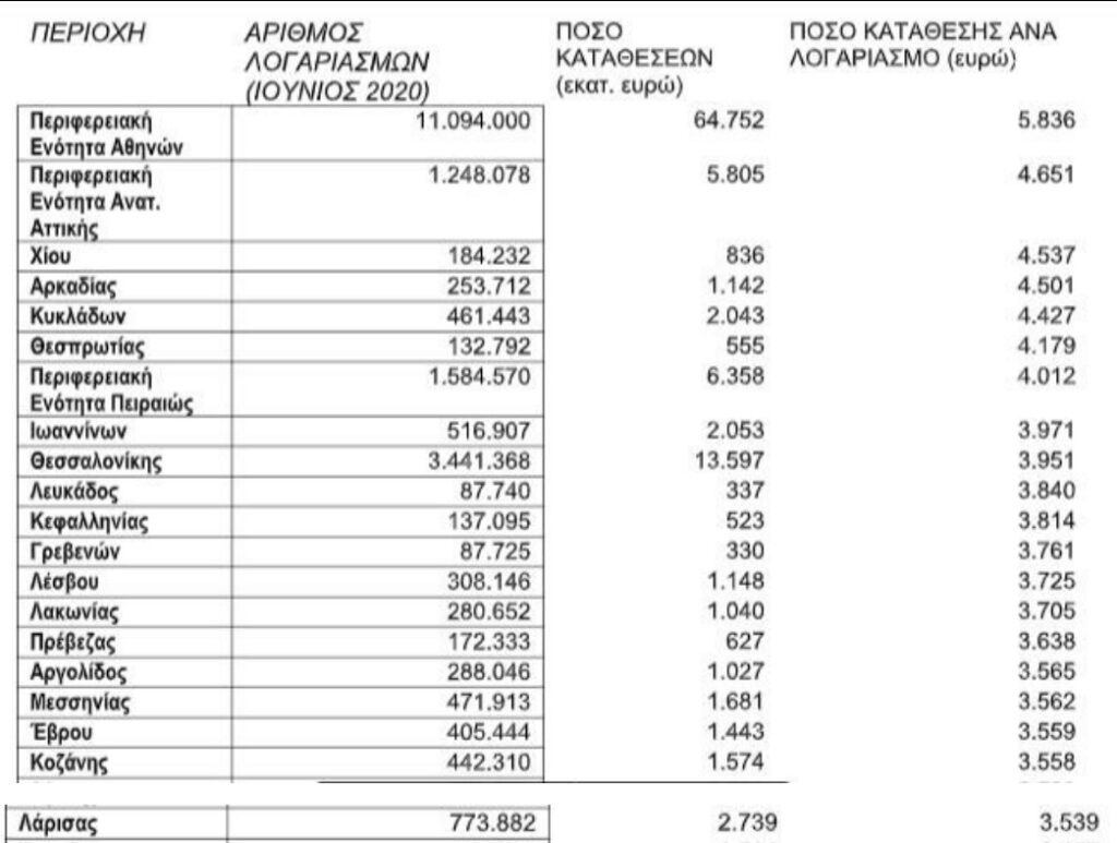 Στη δημοσιότητα δόθηκαν τα επικαιροποιημένα στοιχεία της Τράπεζας της Ελλάδος (ΤτΕ) για τις καταθέσεις ανά νομό.