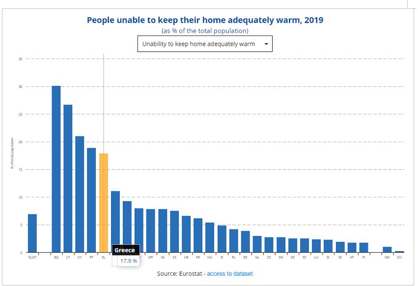Στη χειρότερη κατάσταση είναι τα νοικοκυριά στη Βουλγαρία (30,1%) και ακολουθούν η Λιθουανία (26,7%), η Κύπρος (21%) όπου καταγράφονται όμως υψηλότερες θερμοκρασίες, η Πορτογαλία (18,9%) και η Ελλάδα (17,9%).