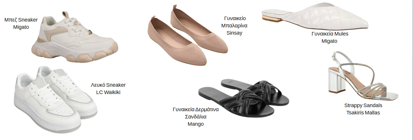 Η ανοιξιάτικη και καλοκαιρινή γκαρνταρόμπα απαιτεί παπούτσια ευέλικτα και άνετα. Τα λευκά ή nude sneakers παραμένουν απαραίτητα για κάθε μέρα. Παράλληλα, ένα ζευγάρι δερμάτινα σανδάλια, mules ή μπαλαρίνες με χαμηλό τακούνι είναι ιδανικά για τις μετακινήσεις από το γραφείο μέχρι τη βραδινή έξοδο. Για τις πιο επίσημες στιγμές, ένα ζευγάρι strappy sandals με χοντρό τακούνι είναι η τέλεια επιλογή για να συνδυάσουν στυλ και άνεση.