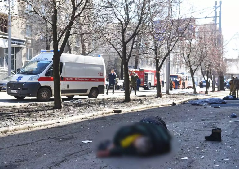 Στον λογαριασμό της στο Telegram, η πολιτοφυλακή άμυνας του Ντονέτσκ δημοσίευσε φωτογραφίες που δείχνουν ματωμένα πτώματα να κείτονται στον δρόμο εν μέσω ερειπίων, αλλά και ένα μικρό λεωφορείο με σπασμένα τα τζάμια.