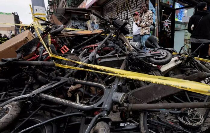Η φωτιά ξέσπασε κατά τη διάρκεια της νύχτας σε μικρό κατάστημα πώλησης και επισκευής ηλεκτρικών ποδηλάτων και πατινιών στο ισόγειο κτιρίου στη Νέα Υόρκη. Φωτογραφία που ανέβασε στο twitter η Πυροσβεστική της Νέας Υόρκης δείχνει «βουνό» από καμμένα συντρίμμια, ιδίως ελαστικά, μπροστά στο κτίριο.
