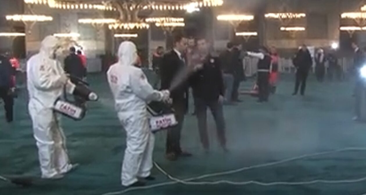 «Καθαρίζουμε επίσης την αυλή, την πλατεία της Αγίας Σοφίας και τα σιντριβάνια με ζεστό νερό. Σκοπός μας είναι να διασφαλίσουμε ότι οι πολίτες θα επισκέπτονται ένα πιο υγιεινό περιβάλλον», τόνισε ο Γκιλντίζ.