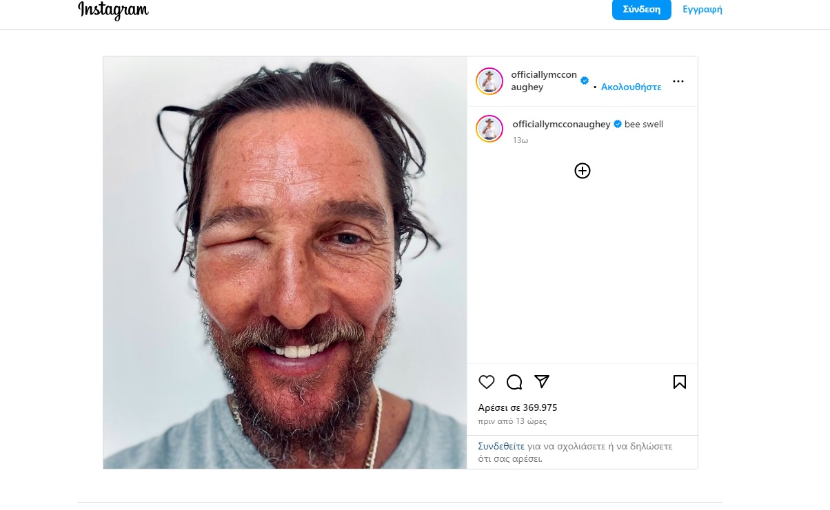 Με μία φωτογραφία στο Instagram αποφάσισε να ενημερώσει τους followers του ο διάσημος ηθοποιός Μάθιου ΜακΚόναχι πως δέχθηκε επίθεση από μέλισσα με αποτέλεσμα να παραμορφωθεί τελείως το μισό του πρόσωπο.
