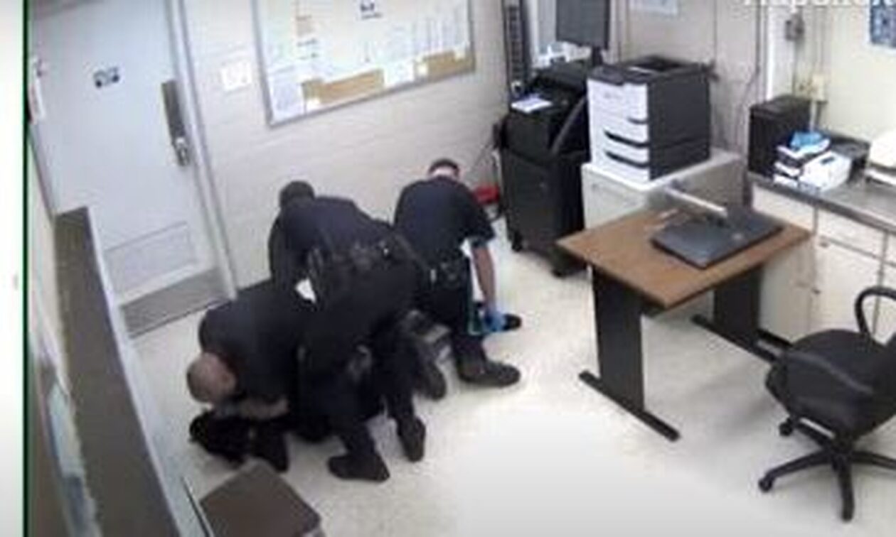 Στο βίντεο από κάμερα ασφαλείας φαίνεται ο 48χρονος αστυνομικός, ο οποίος έχει 14 χρόνια προυπηρεσίας, ξαφνικά να πετάει στο πάτωμα τον άνδρα που είχε συλληφθεί λίγο νωρίτερα και στη συνέχεια – με τη συνδρομή συναδέλφων του που κρατάνε ακινητοποιημένο τον άνδρα – να χτυπάει το κεφάλι του στο πάτωμα περισσότερες από μια φορές.