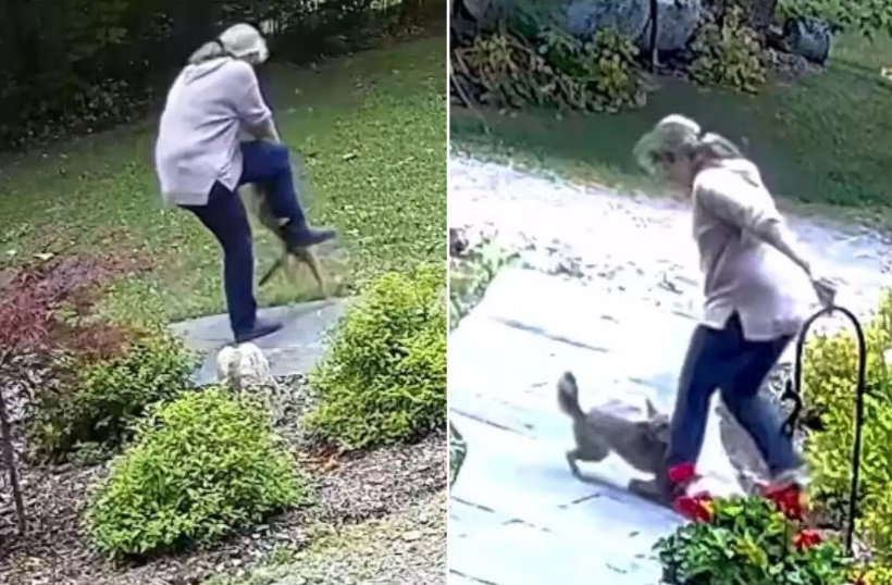 Η γυναίκα τότε κάνει κύκλους, σηκώνοντας το ένα πόδι πάνω από το άλλο, σε μια προσπάθεια να απομακρύνει την αλεπού από το πόδι της. Κάποια στιγμή, φαίνεται να τη σηκώσει με τα χέρια της και τη χτυπάει στο έδαφος. Η αλεπού, ωστόσο, δεν κρατιέται και αρχίζει να πηδάει πάνω στη γυναίκα πριν εκείνη κάνει μερικά βήματα πίσω και την κλωτσήσει.
