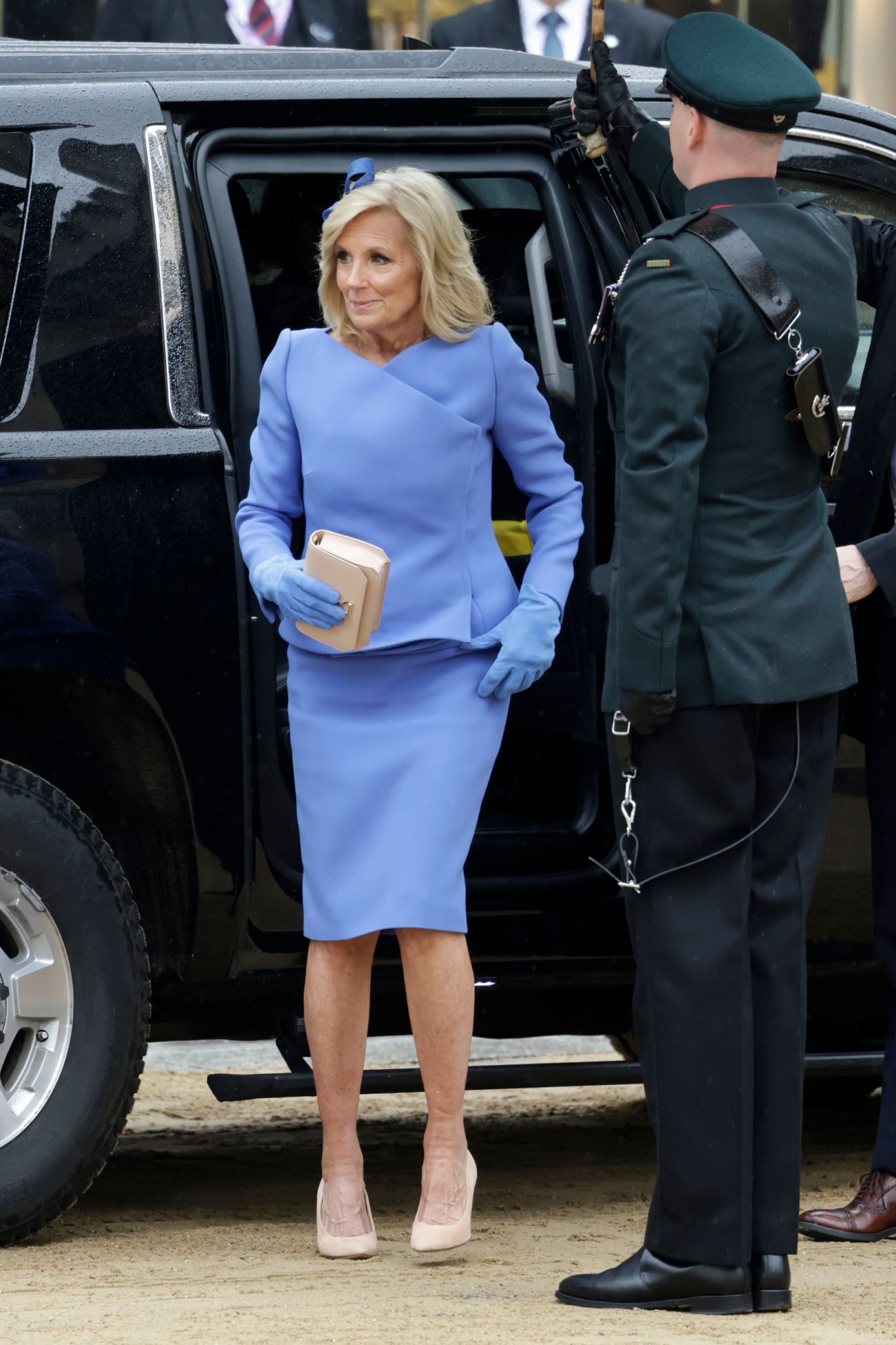 Ο πρόεδρος των ΗΠΑ, Jo Biden, έστειλε τη σύζυγό του για να εκπροσωπήσει τις Ηνωμένες Πολιτείες στη στέψη και η Jill έφτασε με μια κομψή, μπλε midi φούστα και ασορτί σακάκι, με έναν φιόγκο στα μαλλιά. Το look ολοκλήρωσε με ένα ζευγάρι nude stilettos και ένα μικρό clutch bag.