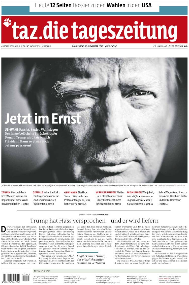 Το πρωτοσέλιδο της γερμανικής Tageszeitung την Πέμπτη: «Σοβαρά τώρα», με τίτλο κειμένου «Ο Τραμπ υποσχέθηκε μίσος, και θα το φέρει».