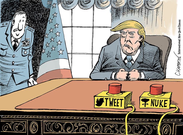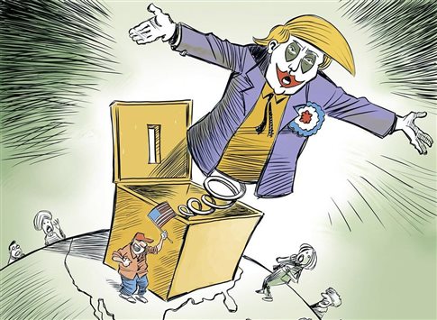 Άλλο σκίτσο του Πατ Τσαπάτι για τους New York Times, που παίζει με την φράση «the clown is out of box» -χρησιμοποιείται για ένα ξαφνικό «κακό» που δεν μαζεύεται: